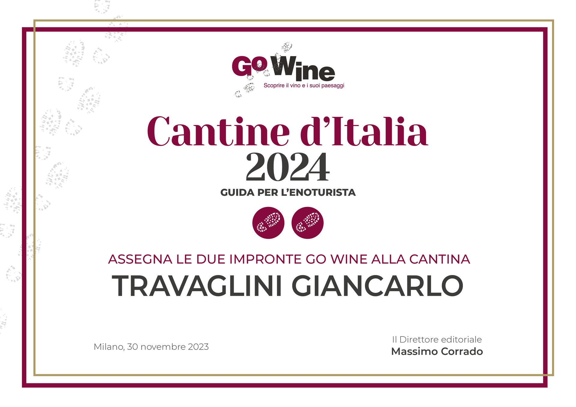 Cantine d’Italia 2024 ha assegnato a Travaglini Giancarlo il riconoscimento Le Due Impronte.